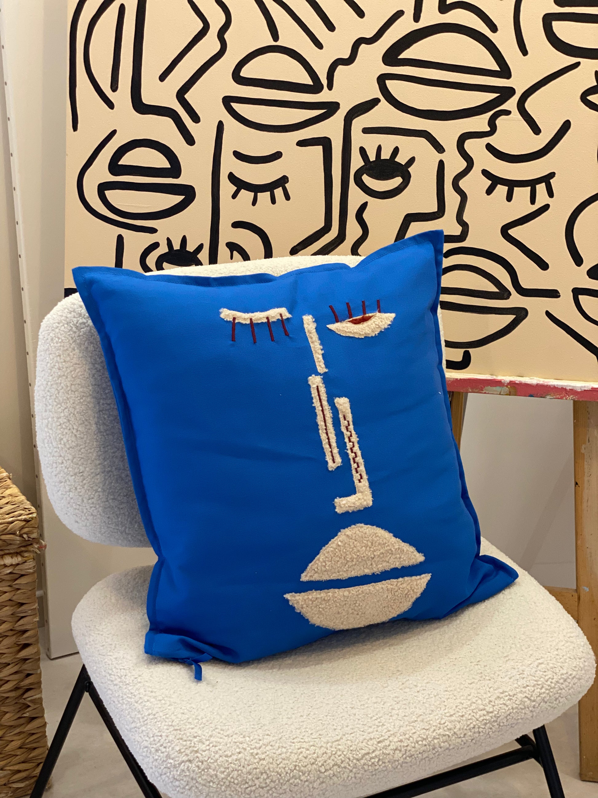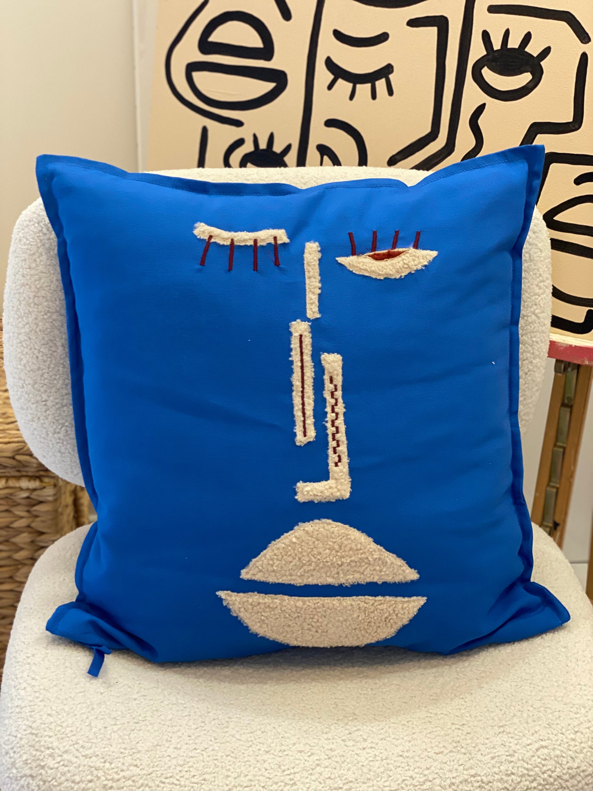 Coussin déco BLEU détails beige/ bordeaux