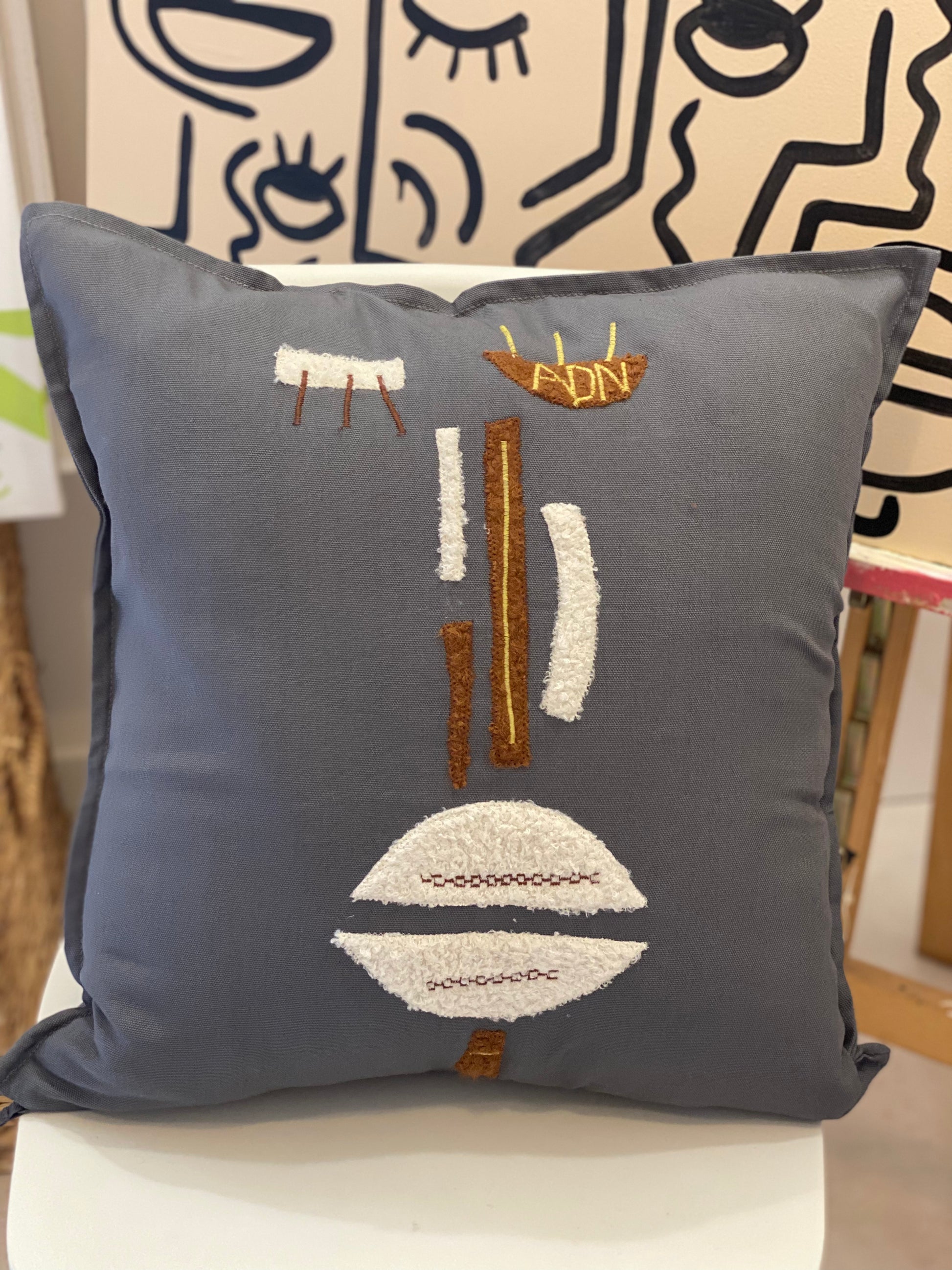 Coussin déco gris détails marron/beige