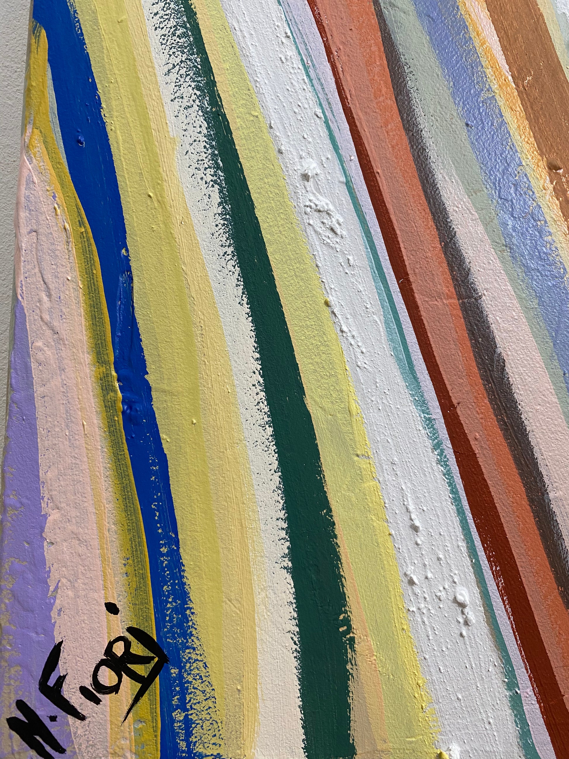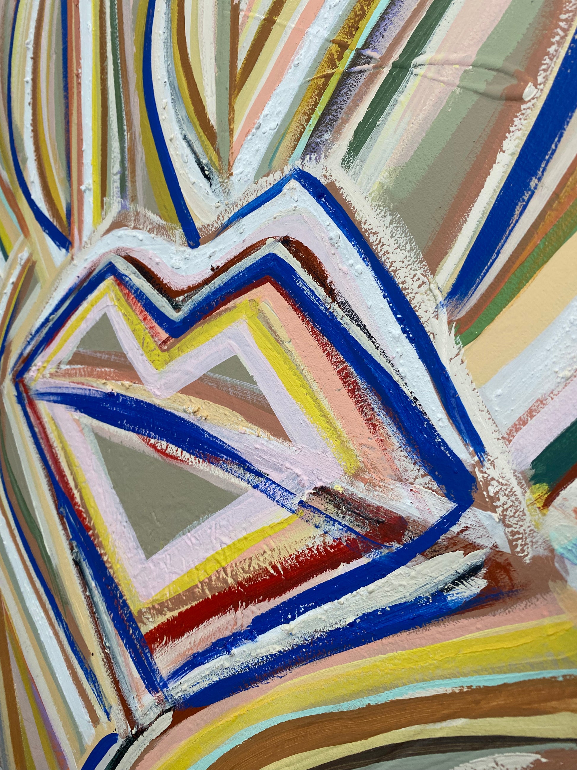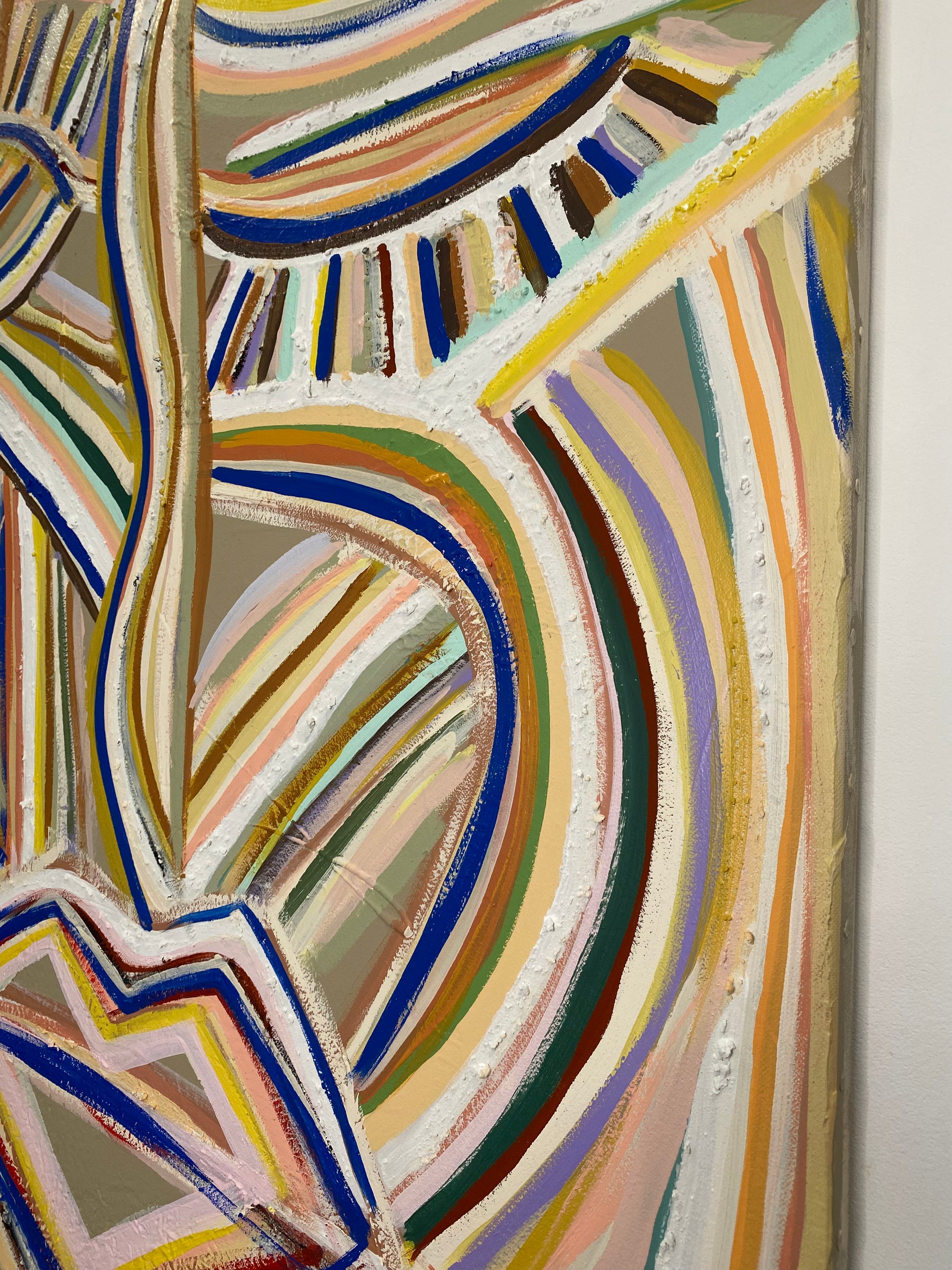 Explosion solaire de couleurs et matières , ou la chaleur rencontre l'expression artistique. Dans une palette très colorée ce visage abstrait se créer avec des lignes solaire qui s'entrelacent et qui créer ce personnage reposé, serein, silencieux ..